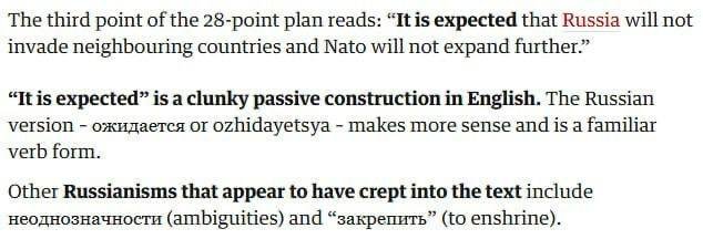 В американському «мирному плані» виявили формулювання, які з самого початку були написані російською мовою, — The Guardian.