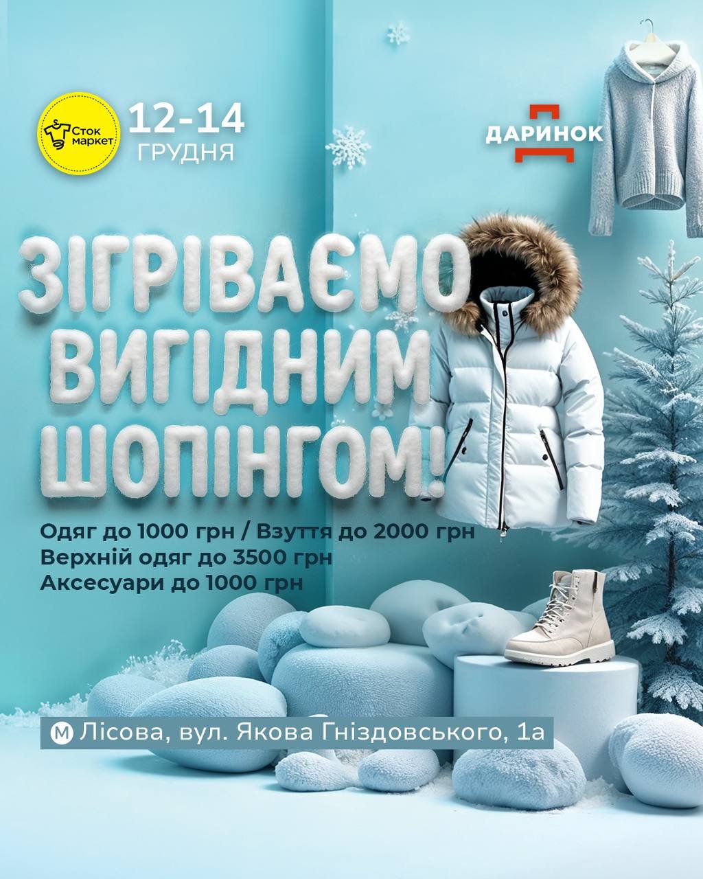 Сток маркет - це триденний марафон вигідного шопінгу на Даринку🛍️ 12-14 грудня на вас чекає широкий вибір товарів за суперцінами: ❄️Одяг до 1000 грн ❄️Взуття до 2000 грн ❄️Верхній одяг до 3500 грн ❄️Аксесуари до 1000 грн 📍Маркет-молл Даринок, вхід 2, локація біля магазину Sinsay ✅ Лише три дні, з 12:00 до 18:00 Зігріваємо найкращими цінами👐 Деталі: https://bit.ly/4oAmFBk