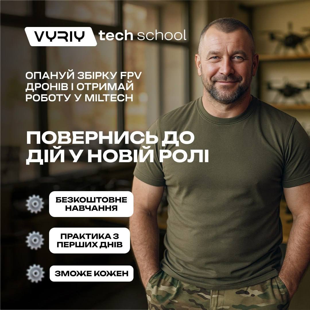 І якщо ти шукаєш стабільну роботу в цивільному житті, яка дозволяє й надалі робити внесок у оборону — це для тебе ✈️ Vyriy Tech School навчає військових, що повернулися з бойових дій і хочуть опанувати нову спеціальність. 🪖 5 днів очного навчання у Києві з практикою на реальному виробничому обладнанні після чого ми пропонуємо працевлаштування у VYRIY. Чому це важливо: ✅ Опануєш збірку FPV-дронів ✅ Отримаєш сучасну технічну професію, затребувану в MilTech ✅ Після працевлаштування навчальні дні компенсуються як робочі Це не просто новий етап. Це можливість продовжувати боротьбу підтримуючи оборонну індустрію. Запис за посиланням: https://www.vyriy.school