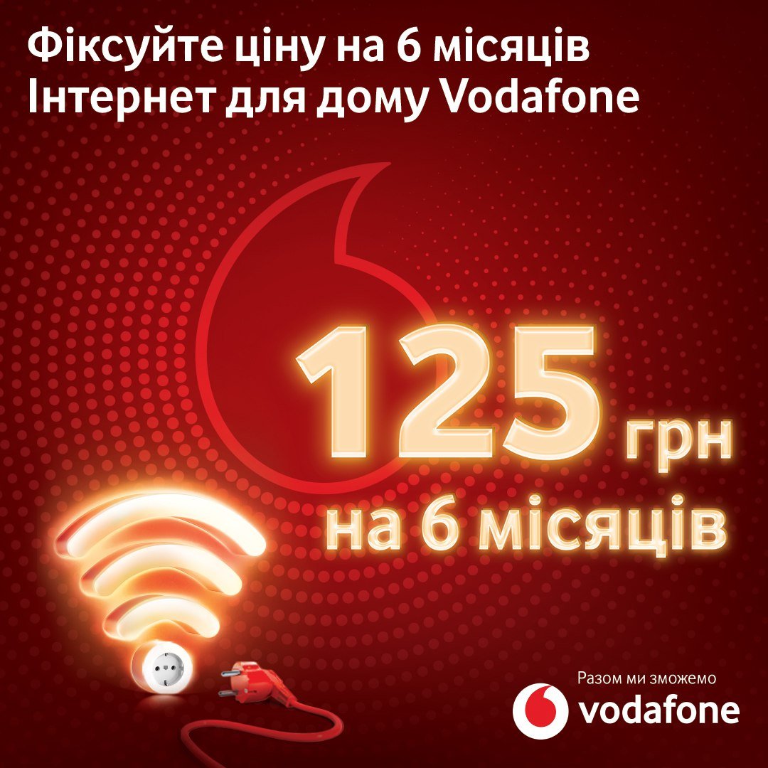 125 грн/міс аж на пів року на інтернет для дому Vodafone. 🔴 Vodafone Gigabit Net— працює без світла до 100 годин 🔴 Швидкість до 1 Гбіт/с — працюйте, дивіться ТВ, грайте без обмежень 🔴 GPON-технологія — сучасне і стабільне з’єднання 🔴 Підключаємо безплатно — залишайте заявку на сайті Перевірте наявність Gigabit Net у вашому будинку та залишайтесь онлайн!