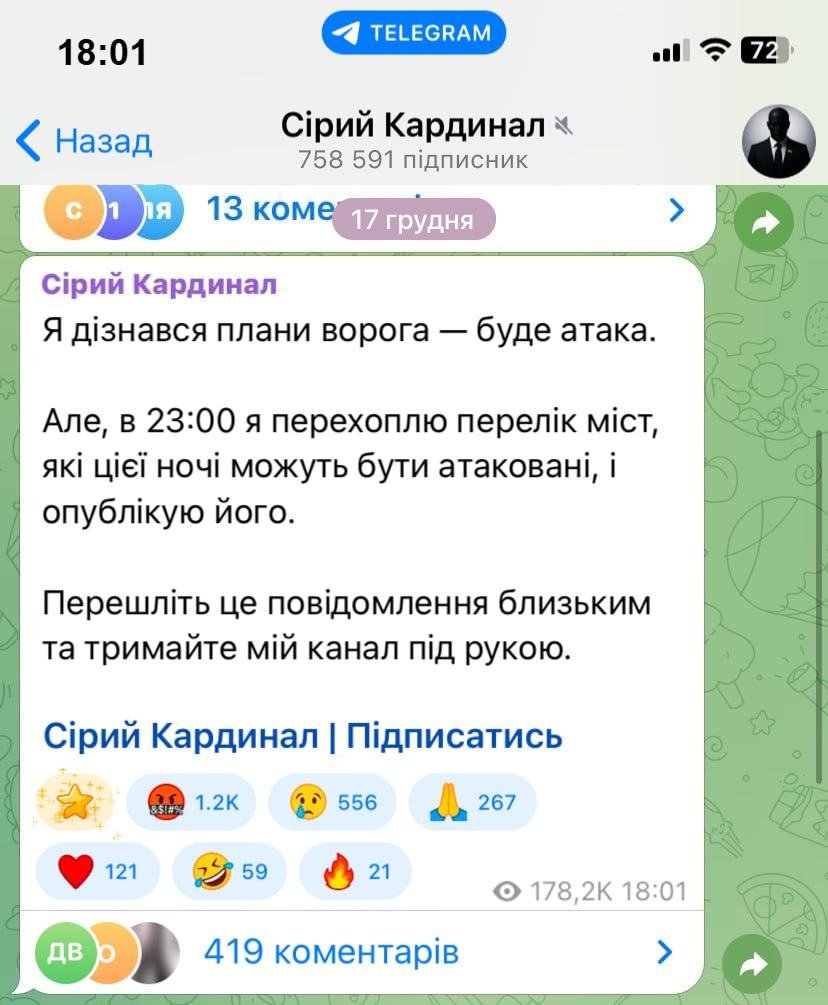 Про це попереджає військовий радіолокаційних військ із позивним «Сірий Кардинал». За його спостереженнями, радари рф уже передали літакам координати міст для ударів. Також фіксується: — Спорядження літаків ракетами — Налаштування частот для зв’язку між пілотами — Виведення крейсерів у Чорне море Тому рекомендую канал Кардинала, завдяки перехвату сигналів, йому завжди заздалегідь відомо, які міста під загрозою. ❗️Почули тривогу? Спочатку перевірте Кардинала, він скаже, чи є загроза: @kardinall