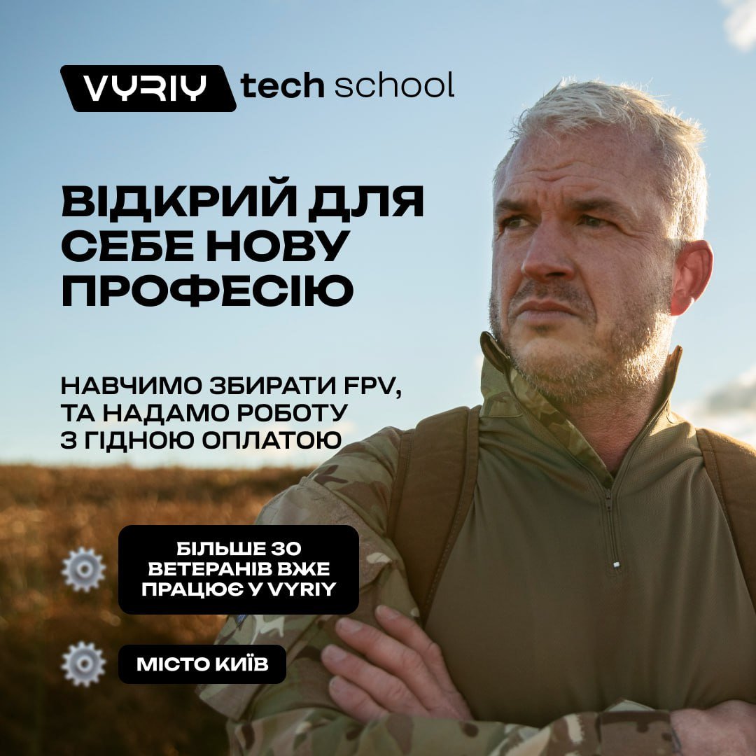 І якщо ти шукаєш стабільну роботу в цивільному житті, яка дозволяє й надалі робити внесок у оборону — це для тебе ✈️ Vyriy Tech School навчає військових, що повернулися з бойових дій і хочуть опанувати нову спеціальність. 🪖 5 днів очного навчання у Києві з практикою на реальному виробничому обладнанні після чого ми пропонуємо працевлаштування у VYRIY. Чому це важливо: ✅ Опануєш збірку FPV-дронів ✅ Отримаєш сучасну технічну професію, затребувану в MilTech ✅ Після працевлаштування навчальні дні компенсуються як робочі Це не просто новий етап. Це можливість продовжувати боротьбу підтримуючи оборонну індустрію. Запис за посиланням: https://www.vyriy.school