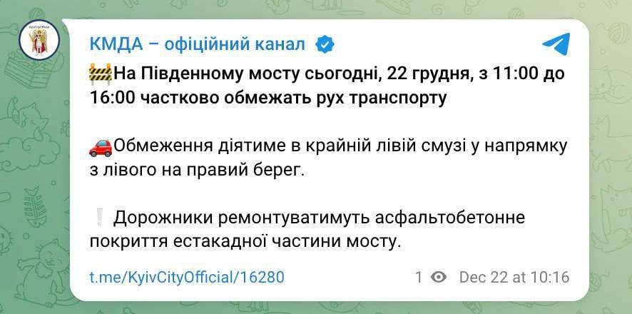 ⚠️Сьогодні, 22 грудня, на Південному мосту з 11:00 до 16:00 буде частково обмежено рух транспорту Роботи проходитимуть у крайній лівій смузі в напрямку з лівого на правий берег.