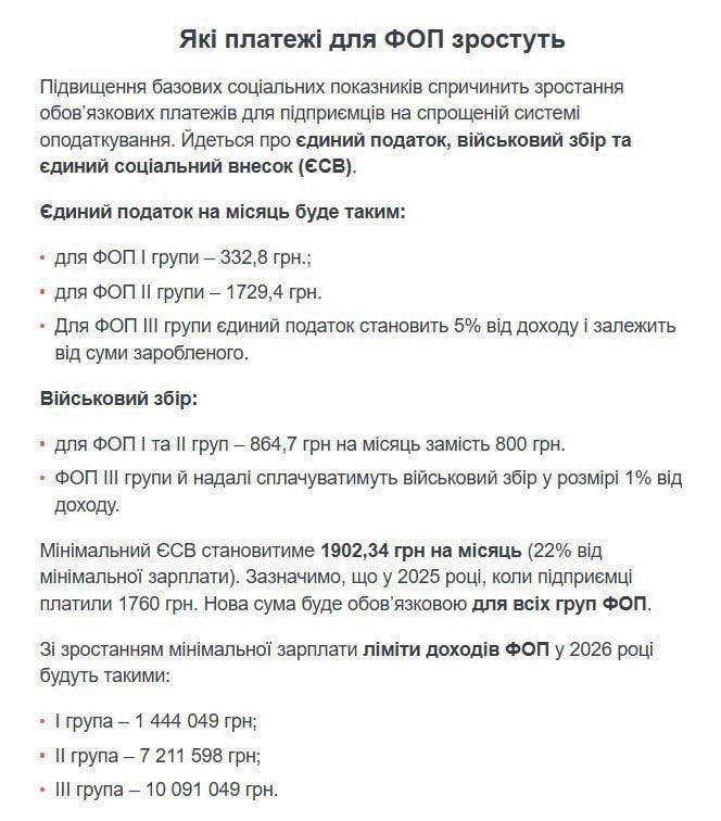 ❗️З 1 січня податки для ФОПів зростають через підвищення мінімальної зарплати до 8647 грн: ▪️Військовий збір (І–ІІ групи) — 865 грн (+65) ▪️ЄСВ — 1902 грн (+142) ▪️Єдиний податок: ▪️ І група — 333 грн (+65) ▪️ІІ група — 1729 грн (+309) ▪️ІІІ група — без змін ㅤ ➡️Надіслати нам новину: @levii_bereg_kyivbot 👉Підписатись: @kiev_levyy_bereg