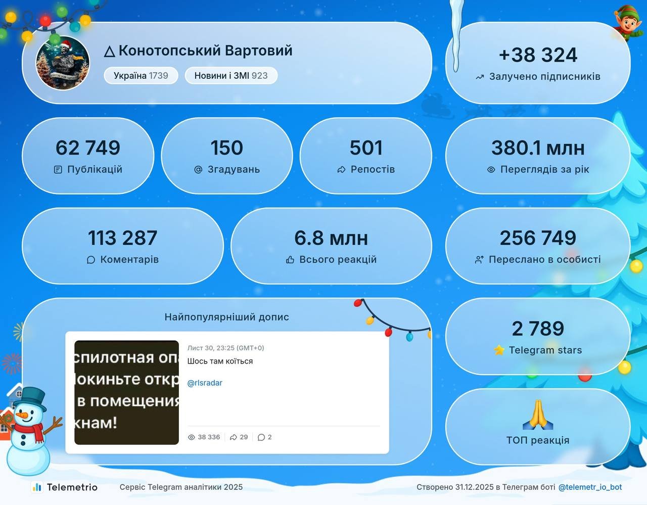 @rlsradar • 31.12.2025 19:21 Київ А це друзі, наша статистика каналу за рік…. Це якісь дива, 380 мільйонів переглядів, репости, реакції, зірки… Дякую кожному хто зі мною, люблю вас, ми працюємо та будемо працювати! З наступаючим! ❤️ @rlsradar Джерело Поділитися