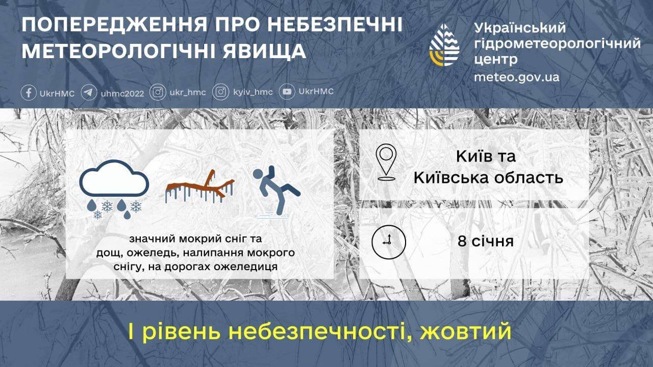 Будьте обережні на дорогах 8–9 січня. Діє I рівень небезпеки (жовтий). ㅤ ➡️Надіслати нам новину: @levii_bereg_kyivbot 👉Підписатись: @kiev_levyy_bereg