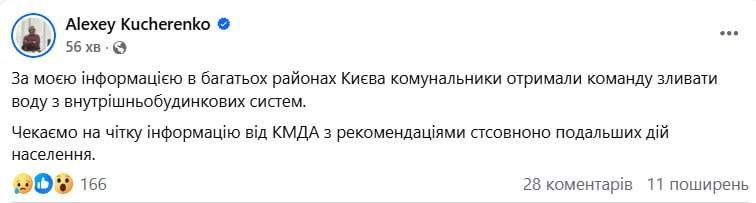 У багатьох районах комунальники отримали команду зливати воду з внутрішньобудинкових систем, щоб запобігти пошкодженню труб та батарей під час блекауту, — нардеп Кучеренко. ㅤ ➡️Надіслати нам новину: @levii_bereg_kyivbot 👉Підписатись: @kiev_levyy_bereg