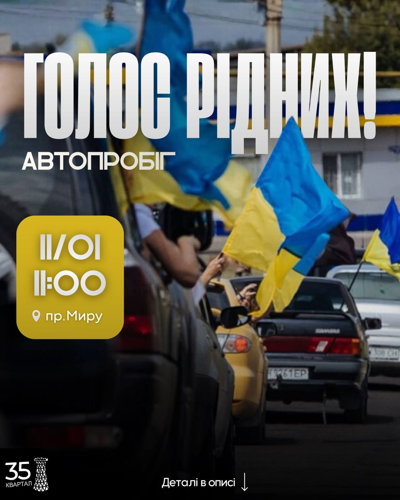 Учасники на автомобілях проїдуть містом, щоб вшанувати пам'ять захисників, які зараз мають статус зниклих безвісти або перебувають у полоні. Маршрут почнеться від алеї пошани та продовжиться далі проспектом до колієпровіду. Цією акцією ми нагадуємо суспільству, що кожна історія важлива, та створюємо простір для підтримки родин, які чекають на повернення близьких. Закликаємо поширити інформацію про автопробіг у соціальних мережах та місцевих спільнотах, щоб до нього приєдналося більше учасників. @kvartal35