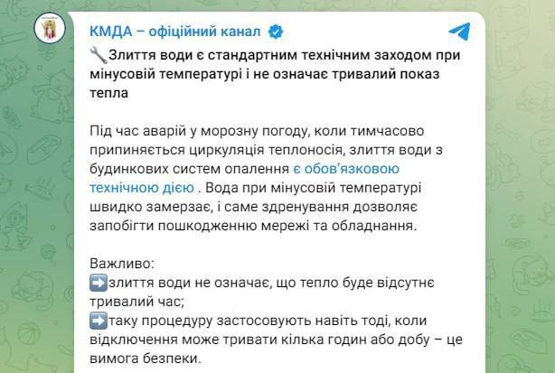 Злив допомагає цього уникнути. Ця процедура не означає тривалу відсутність тепла і застосовується навіть при короткострокових відключеннях задля безпеки. ㅤ ➡️ Запропонувати новину 👉Підписатись: @kiev_levyy_bereg