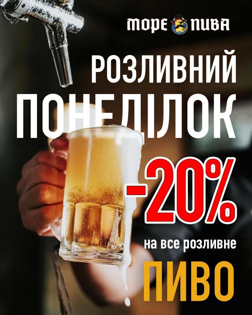 ⚓️РОЗЛИВНИЙ ПОНЕДІЛОК у «Море Пива»⚓️ Твоє улюблене море стало на 20% глибшим доступнішим 🍻 Відтепер кожного понеділка змиваємо стандартні ціни на всі сорти пінного та заливаємо вигодою: 👉 –20% на ВСЕ РОЗЛИВНЕ ПИВО!🍺🍺 Чекаємо на борту, щоб наповнити твої запаси.