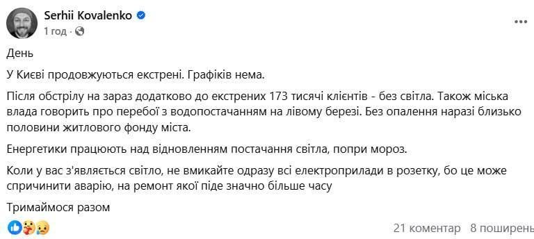 @kiev_levyy_bereg • 20.01.2026 13:50 Київ 😢Після обстрілу рф близько половини Києва наразі залишаються без опалення, — гендиректор Yasno Сергій Коваленко Без світла — 173 тисячі споживачів. ㅤ ➡️Надіслати нам новину: @levii_bereg_kyivbot 👉Підписатись: @kiev_levyy_bereg Джерело Поділитися